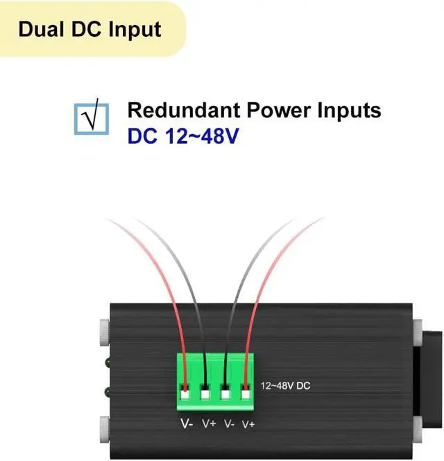 Secure Installation : DIN-rail mounting with 12-48VDC redundant power input and 6cm elevated groove design provides enhanced protection against dust, moisture and physical damage.