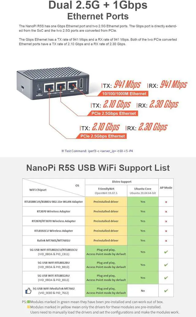 [Dual 2.5G Ethernet Ports] The NanoPi R5S mini router features three Ethernet ports: 1 x Native Gigabit Ethernet (RTL8211F-CG chip), 2 x PCIe 2.5G Ethernet (RTL8125BG chip).