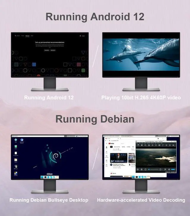 [Operating System Support] The NanoPi R5S WiFi Router is compatible with Android, Debian, Ubuntu Desktop, Buildroot, and other systems, including headless operation. It decodes 4K60p H.265/H.264 video formats.