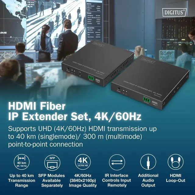 High range: AV signal transmission via fibre optic cable - single mode up to 40 km, multi-mode up to 300 m - point-to-point connection