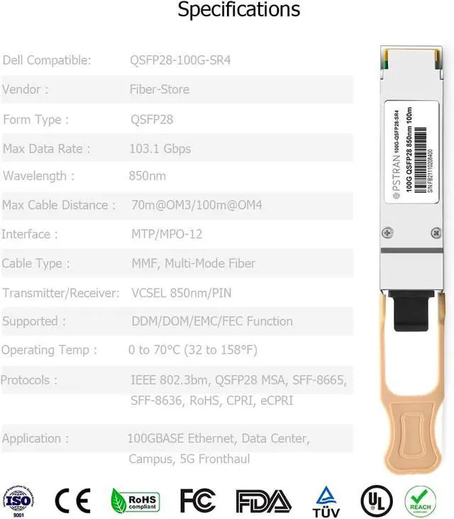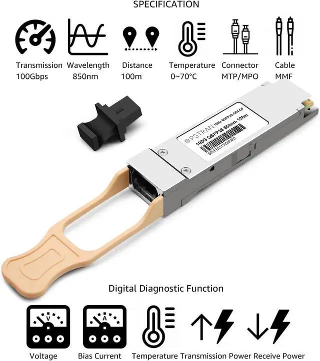 100GBASE-SR4 QSFP28 Optical Transceiver Module, Built-in high performance Chip, Max. Power Consumption 2.5W enable Prolonged Service Life, Commercial Temperature Range 0 to 70°C (32 to 158°F)
