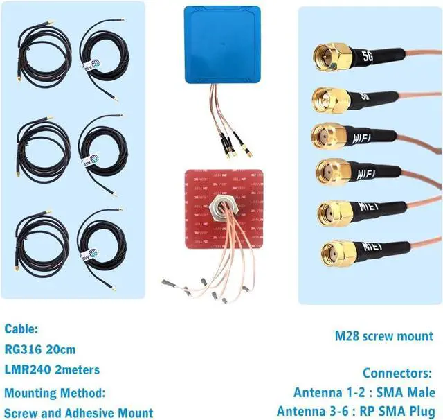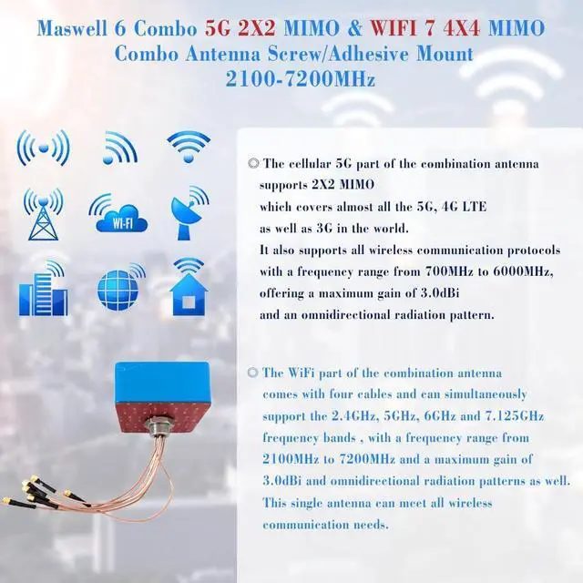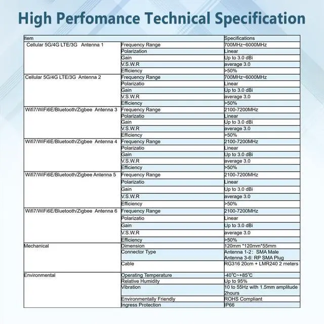 Full-band design:Our cellular antennas offer broad compatibility from 700-6000 MHz, providing full coverage of 5G, 4G, LTE, 3G, 2G, Bluetooth, WiMAX, Zigbee and WiFi 6 bands, making them the solution for All network operators worldwide. The WiFi antenna has a frequency range of 2100 to 7200 MHz, for WiFi 7, WiFi 6E, Bluetooth, Zigbee and Wimax.