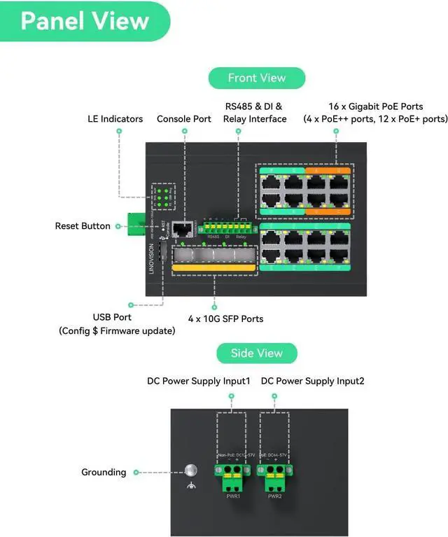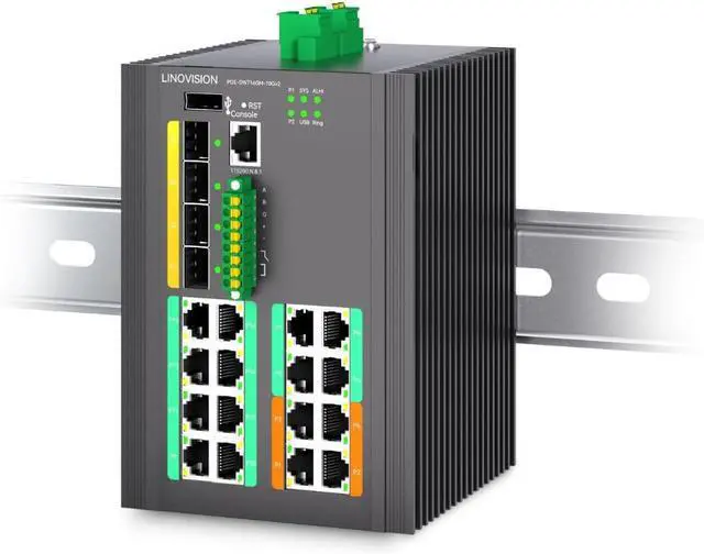 INDUSTRIAL L3 MANAGED POE SWITCH - Supports Static and Dynamic Routing, RIP, OSPF, BGP4,ECMP, VRRP, etc. It can be managed via WEB, CLI or SNMP.