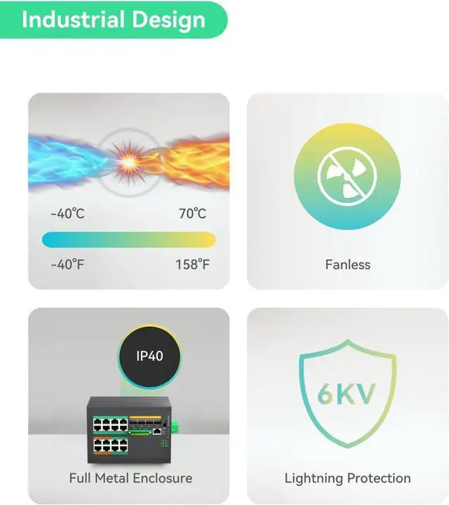 INDUSTRIAL DESIGN - IP40 metal shell & fanless design. Support DIN-rail. Wide working temperature -40 to +70. 6KV surge immunity and 8KV ESD protection.