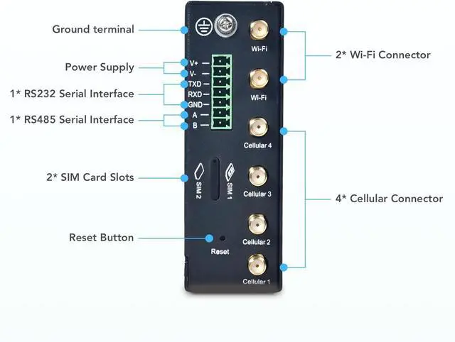 Gigabit Ethernet & Industrial RS Ports Equipped with 4 x 10/100/1000Mbps Gigabit Ethernet ports (with 1.5KV isolation protection), configurable as WAN/LAN/VLAN. Includes essential industrial serial interfaces: 1 x RS232 and 1 x RS485 (with 15KV ESD protection), enabling seamless data collection from industrial terminals.