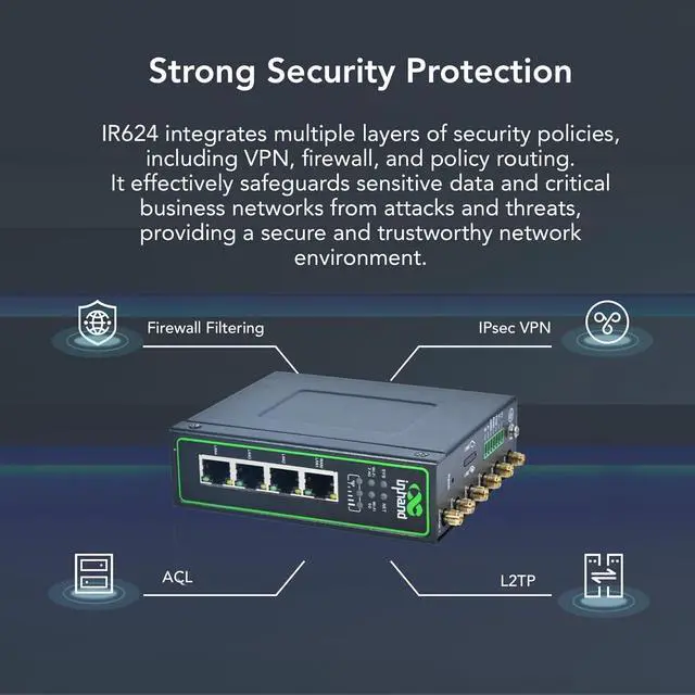 Secure & Cloud-Managed IoT Solution Integrates robust security policies including IPsec VPN and L2TP VPN , firewall filtering, and access control to safeguard sensitive data. Connects to the DeviceLive IoT platform for real-time monitoring, diagnosis, and remote maintenance of thousands of distributed devices, making management easier and more efficient.