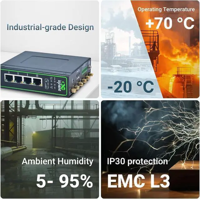 Rugged Industrial Design & Certification Features a durable IP30 rated metal housing with a fanless design, and supports DIN-rail installation. Operates reliably across a wide temperature range of -20°C to 70°C. Certified by major carriers like AT&T, T-Mobile, and Verizon.