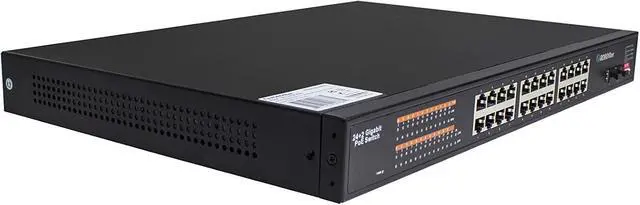 24-port 10/100/1000Base-T RJ45 + 2 uplink 1000Base-X SFP slots, 1RU 19" rack mountable with brackets, 350W of PoE budget, 802.3at/af compatible (supporting PoE+ on each TP port)
