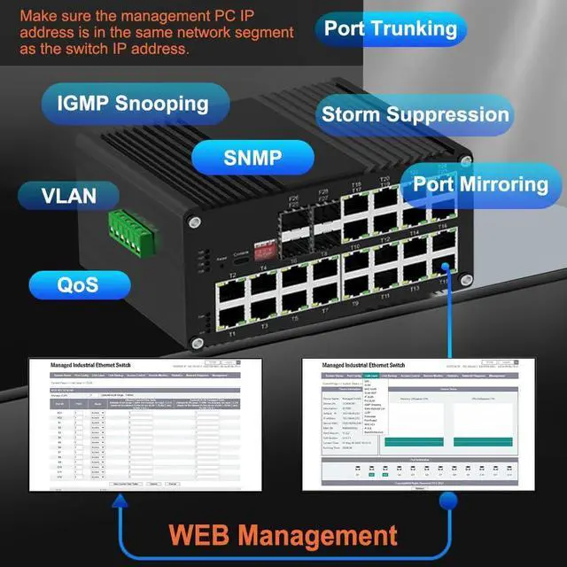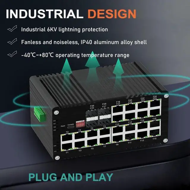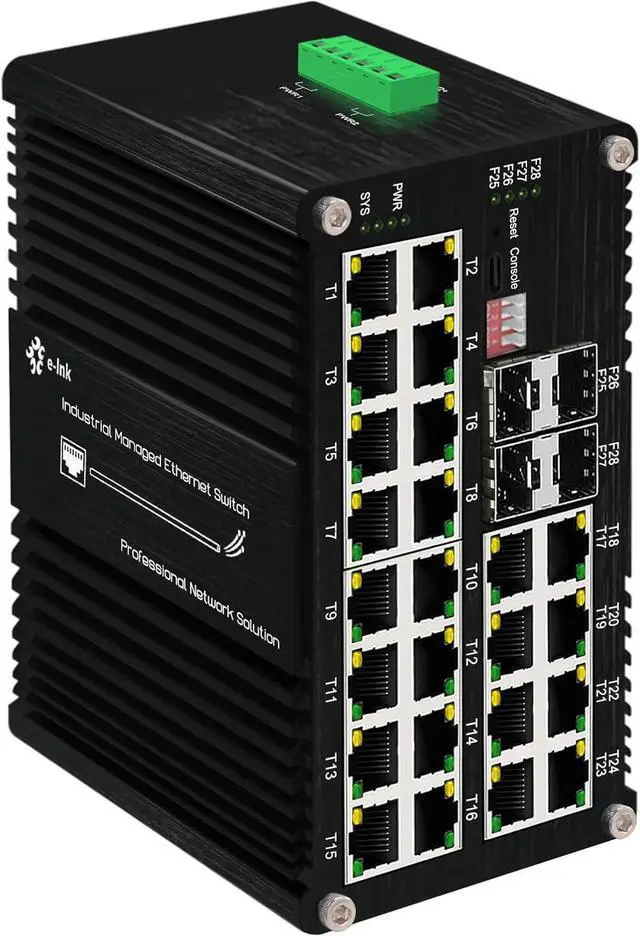 This Ethernet Switch is a Layer 2+ managed device featuring 24 ports for 10/100/1000Base-T with 802.3at PoE support, alongside 4 1000Base-X SFP fiber ports. The switch comprises 24 twisted pair (TP) ports and 4 fiber ports. The TP (RJ45) interfaces support 10/100/1000Base-T(X), accommodating both full-duplex and half-duplex modes, as well as automatic MDI/MDI-X configuration. Meanwhile, the 1000Base-X SFP ports are compatible with both single-mode and multi-mode fiber, supporting one or two cores.