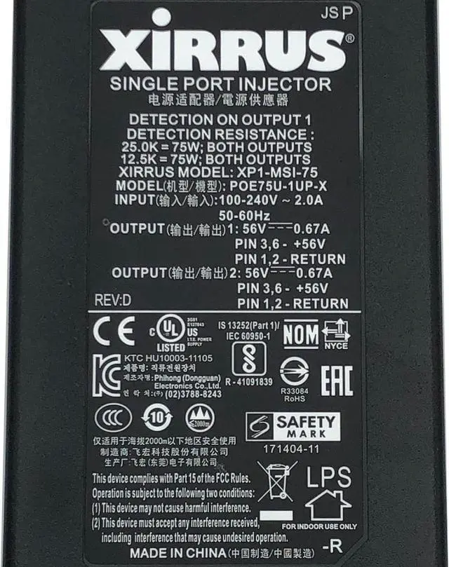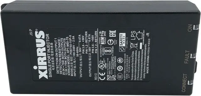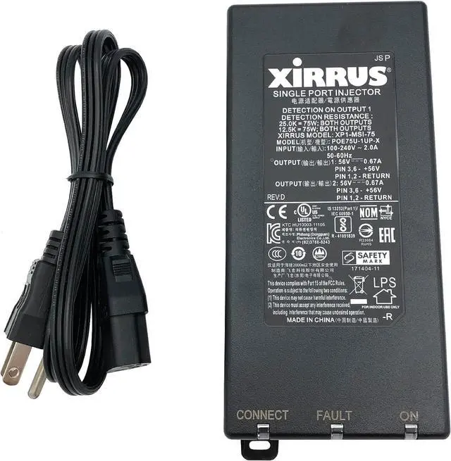 SPECIFICATIONS: Brand: Xirrus; Wattage: 75W; Output: 56V 0.67A; Worldwide Input Voltage: 100-240V~2A 50-60Hz; Model: POE75U-1UP-X