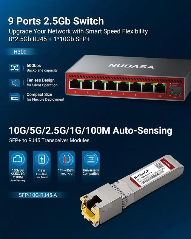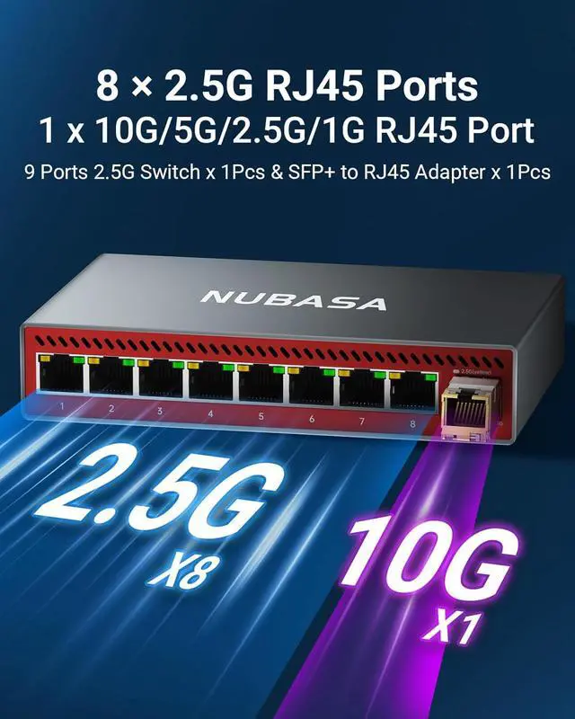 Built-in 10G SFP+ Uplink Port + Included 10G/5G/2.5G/1G Auto-Sensing Copper TransceiverConnect the switch to a 10G/5G/2.5G-capable router or core switch or NAS using the SFP+ port and included 10G/5G/2.5G/1GBASE-T Auto-Sensing adapterperfect for high-speed backbone links
