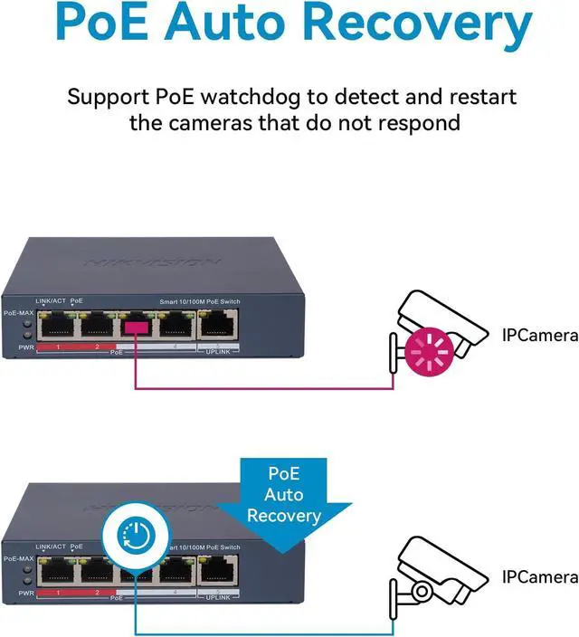 Maintain constant operation with the integrated smart watchdog feature that automatically monitors connected devices. If a camera or other PoE equipment stops responding, the system instantly reboots it to restore functionality, ensuring your surveillance remains active day and night