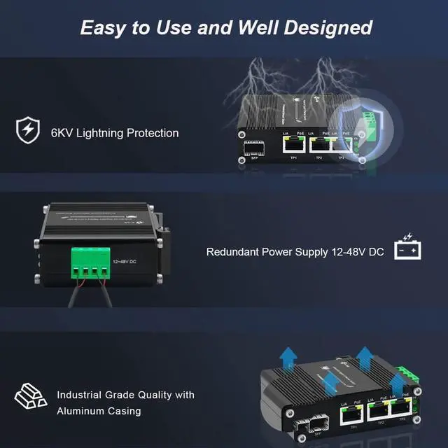 Widely UsedThe Industrial Switch Featured with IP40 Aluminum protection grade, it can work in a wide temperature range from -40°C to 80°C (-40°F to 176°F). 6KV lightning protection, adapt to various harsh environments. Widely used in IP cameras, Wireless Access Point, Computer Networks etc.
