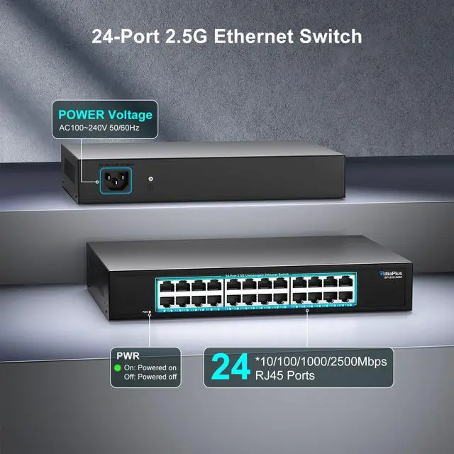 24*2.5G Ultra-Fast Network Speed: The network switch includes 24*100/1000/2500Mbps RJ45 Ethernet ports, ports 1-24 comply with the IEEE802.3bz (2.5G) standard, support 10/100/1000M/2.5G self-adaptation, and 120Gbps switching capacity to meet the needs of high speed network requirements.