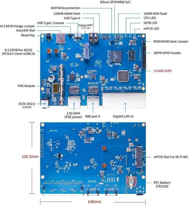 [Siflower SF21H8898 SoC] The Banana Pi BPI-RV2 RSIC-V OpenWRT Open Source Samrt Gateway Router Board is a Siflower SF21H8898 SoC-based device with 512MB DDR3 memory, 128 MiB NAND, 16 MiB NOR Memory, and supports PoE network power.