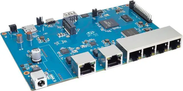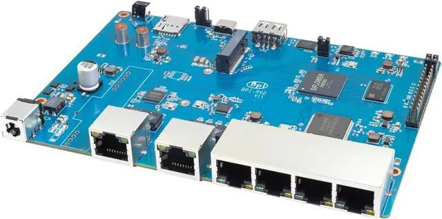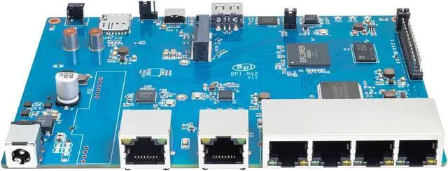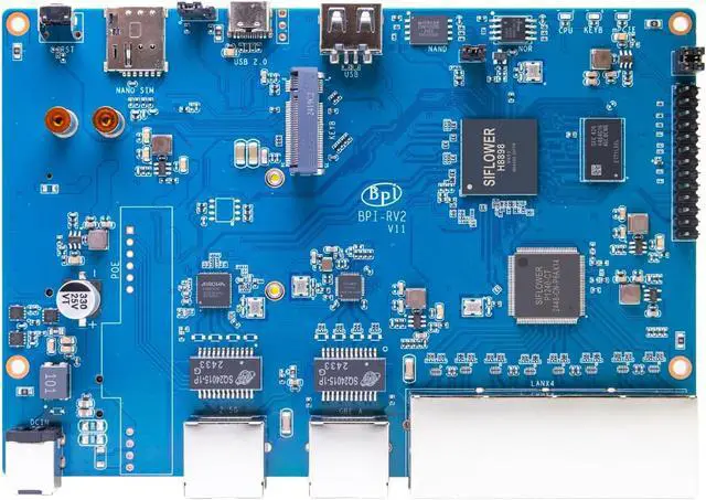 [Enterprise Gateway] BPI-RV2 RSIC-V is an open source office home gateway router board supporting external DDR3/DDR3L/DDR4 SDRAM and NAND/NOR SPI Flash. High-speed ports include USB2.0, PCIE2.0, and low-speed ports include SPI, UART, I2C, and PWM. It can be used as an enterprise gateway or a workstation.