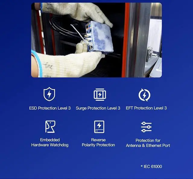 Global 5G (NSA/SA)/4G LTE network with dual SIM cards for backup between multiple carrier networks. Plug& play, supply lightning transmission via Gigabit Ethernet ports.