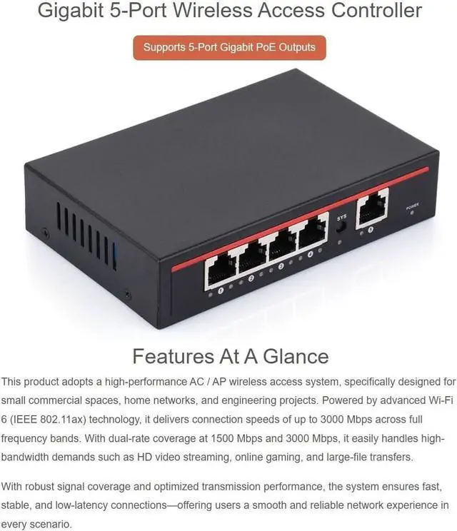 This product adopts a high-performance AC / AP wireless access system, specifically designed for small commercial spaces, home networks, and engineering projects.