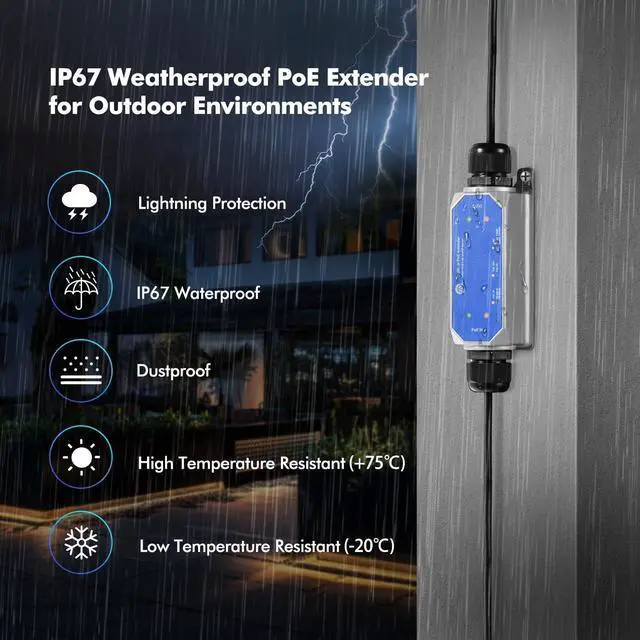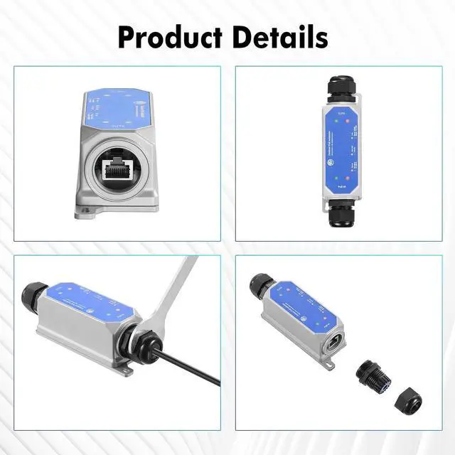 IP67 Outdoor Weatherproof: Rugged industrial grade metal housing, cable interface are all protected in the shell, with waterproof cap, which has better waterproof, dustproof and snowproof effect, and is more suitable for outdoor and indoor environments, such as warehouses, computer rooms, garages, attics, etc. **Pass the network cable through the waterproof cap and then make RJ45 connection**