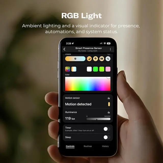Presence + Light, Designed to Work TogetherBy combining always-on presence detection with an RGB indication light, R3 enables more natural automations lights remain on while youre present and turn off only when the room is truly vacant, improving comfort and everyday energy efficiency.