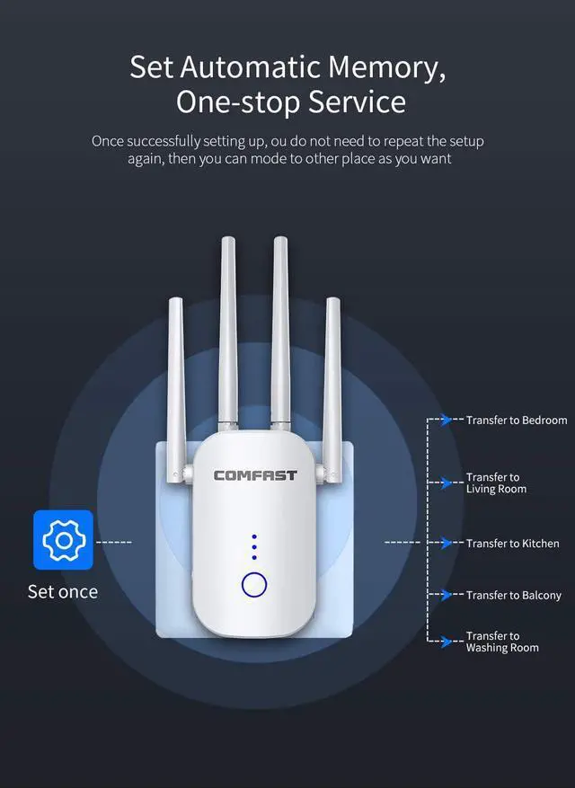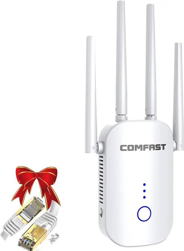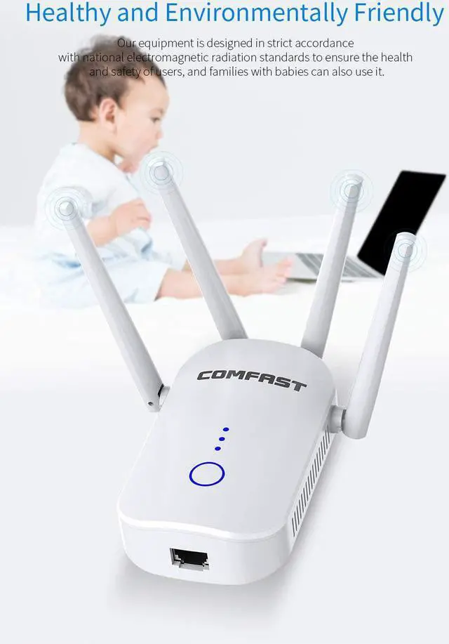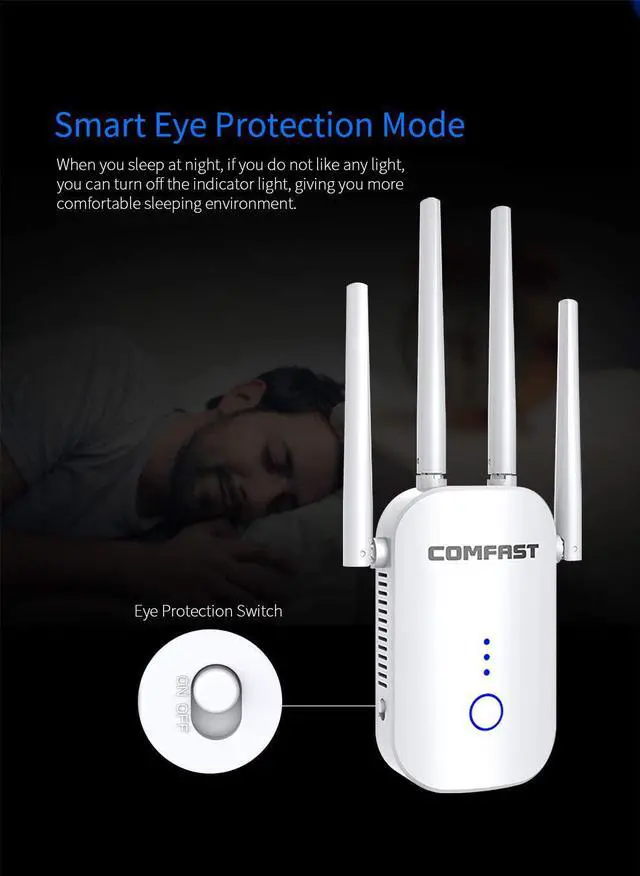 2500FT No dead ends WiFi Range Extender WiFi Extender with 4 antennas and 4 unit expansion system light but powerful easy to place without occupying space can watch live on the balcony kitchen brush recipes and games in the bedroom. Say goodbye to the blind spot of WIFI.: 1200 Mbit / s and dual bands WiFi Repeater uses 1200AC wireless technology if you prioritize 5G channels you will enjoy the speed network. If you want to stay stable you can also choose flexible 2.4G dual-band switching the best choice for video entertainment games.: Compatible with 99Percentage router- this WIFI Range Extender has been tested can compatible with 99Percentage router on the market and works with any standard router or gateway. Support extending to any devices like iOS Android devices Samsung devices Echo/Alexa devices PCs PlayStation smart plugs and so much more. Ideal for HD streaming gaming experience.: 3 in 1 WLAN Repeater US supports three modes for AP /Repeater / Router in order to meet the different requirements of the users.
