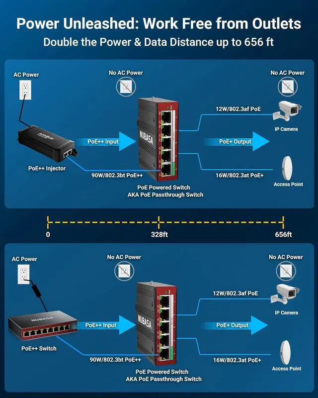 Extend PoE Coverage Up to 656ftPlace this poe extender outdoor/indoor 328ft/100m from your source, and extend reliable gigabit-speed and PoE power another 328ft/100m great for outdoor runs, warehouses, and large buildings