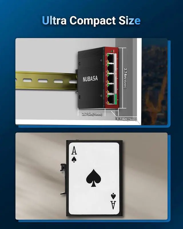 Ultra-Small Size with DIN Rail Mount Easy installation, No configuration needed. This small PoE switchs compact design fits behind panels or inside electrical boxes. Includes DIN rail clip for secure mounting. Fully plug-and-playno software or settings required