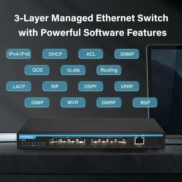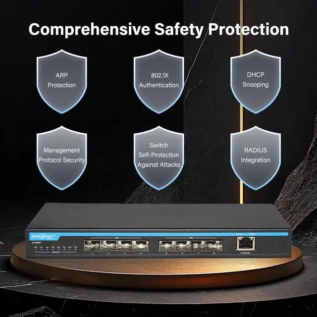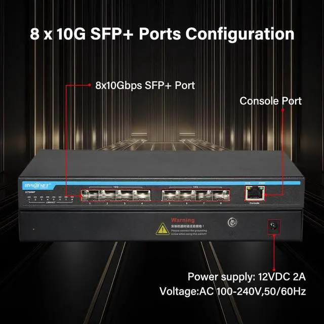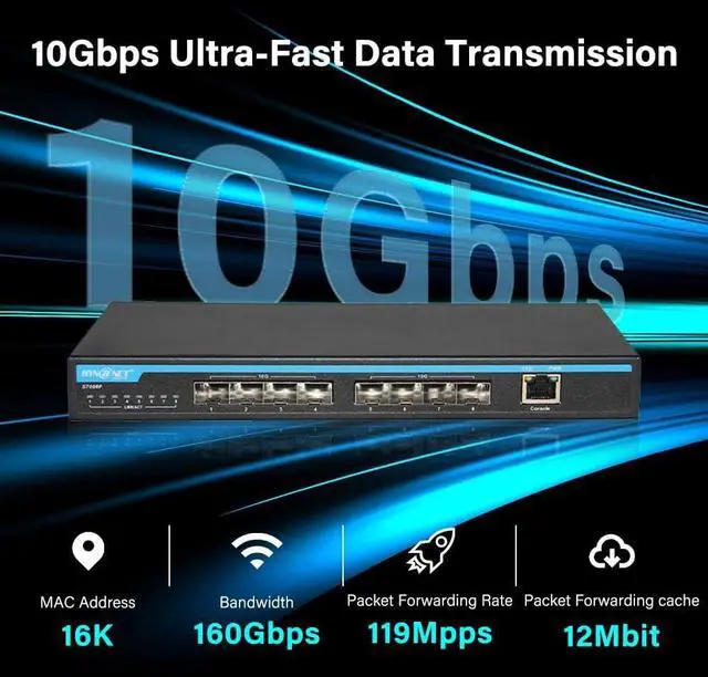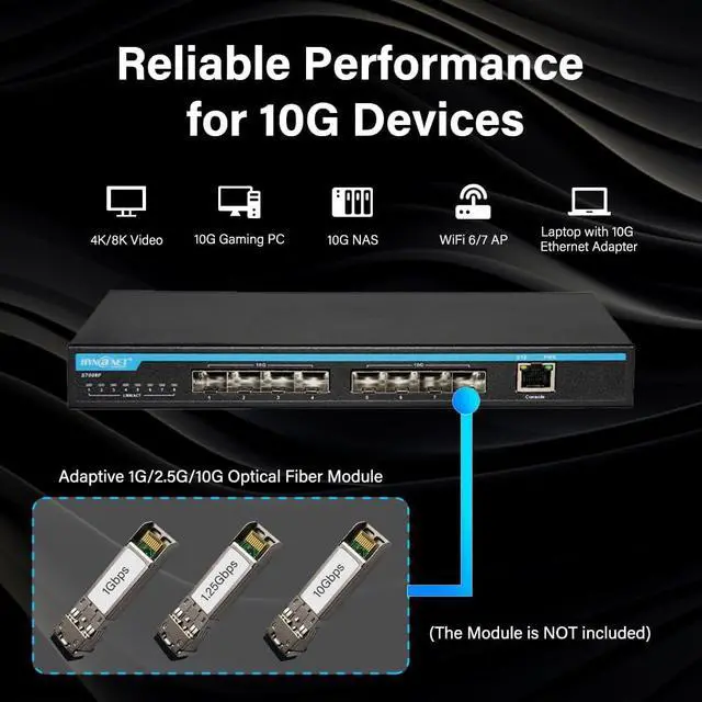 8-Port Multi-Speed ConnectivityFeatures 8×10Gb SFP+ ports (compatible 1G/2.5G Module, not include SFP+ modules) plus 1 Console management port, ensuring broad compatibility with 10Gb NAS, WiFi 7 routers, 10Gb adapters/NICs, servers, gaming PCs, and 8K video devices. Build a more stable, high-capacity network that fits diverse high-bandwidth needs.