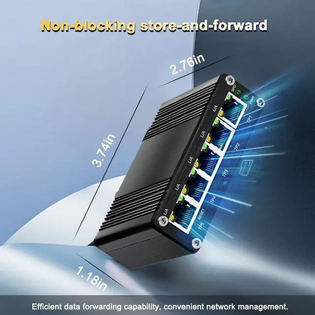 :The management switch size is 3.74x2.76x1.18in and equipped with 5-port 10/100/1000BASE-T RJ45 with auto-MDI/MDI-X function.Supports auto-negotiation,10/100Mbps half/full duplex and 1000Mbps full duplex.