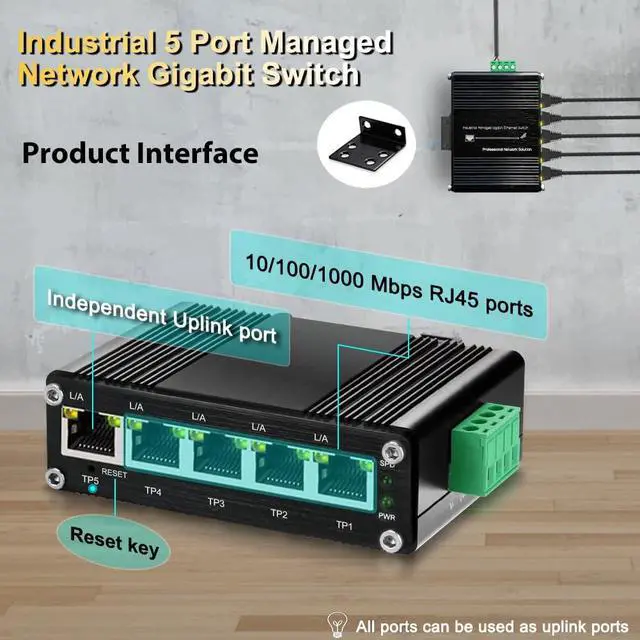 :IP40 protection grade,the managed 5 port switch can work in a wide temperature range from -40°C to 75°C.Supports DIN-Rail and Wall-mount installation.