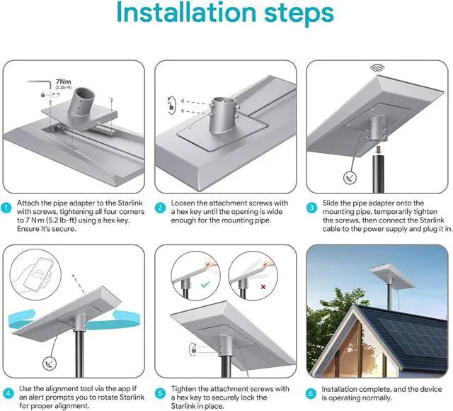 *Easy Setup: Hassle-free installation with included hardware. Just slide the starlink performance gen3 pipe adapter onto the pole, tighten the screws, and place your Starlink v3 hp device. (Note: performance gen 3 Starlink pole required not included).