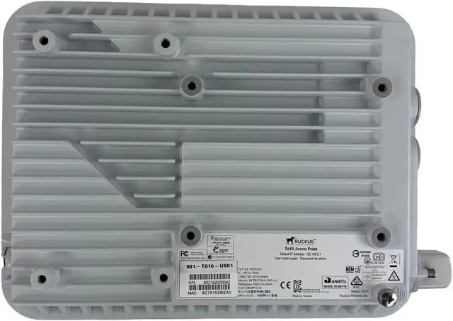 The Ruckus T610-US01 is a high-performance, 802.11ac Wave 2 outdoor access point designed for demanding, high-density environments such as campuses, stadiums, transit hubs, and smart city deployments. Built with internal antennas and BeamFlex+ adaptive antenna technology, it delivers reliable, high-speed Wi-Fi across large outdoor areas while mitigating interference and improving signal quality. With support for MU-MIMO and SmartMesh, the T610-US01 ensures consistent performance for multiple concurrent users and flexible deployment without the need for Ethernet cabling to every AP. This updated model features revised regulatory certifications and hardware improvements for long-term compliance and deployment in evolving network environments, all within a durable, IP-67-rated enclosure built to withstand harsh outdoor conditions. The T610 is the omnidirectional antenna pattern unit. Includes: Ruckus T610 mounting kit quick start guide