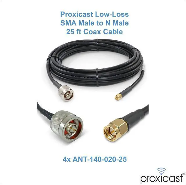 2x Proxicast dual polarized directional 4G LTE / 5G MIMO antennas (ANT-129-001) which are ideal for signal enhancement in virtually any cellular application. They are compatible with 4G/5G data services from Verizon, AT&T, T-Mobile, Bell Mobility, Rogers, Telus and most other cellular operators worldwide. Cross-polarized elements enable multiple input / multiple output (MIMO) connectivity resulting in higher performance.4x Proxicast 25 ft Low-Loss SMA Male to N Male Coax Extension Cables (ANT-140-020-25) which connect the antenna to MIMO capable cellular modems and routers from Cisco, Cradlepoint, Digi, Pepwave and others that have external SMA antenna jacks.4x Proxicast 8 in U.FL to SMA Pigtail Adapters (ANT-105-SMA) which allow connections to the internal antenna jacks on routers and Internet Home Gateways that do not have SMA jacks.1x Proxicast 36 in J-Max-XL Stainless Steel Adjustable Mounting Bracket (ANT-800-JP3-XL) for rust-proof mounting of the panel antennas in a wide variety of locations.A FREE roll of Proxicast's Pro-Grade Extra Strong 30mil Weatherproof Self-Fusing Silicone Rubber Sealing Tape (ANT-900-002) to weatherseal the outdoor coax connections.