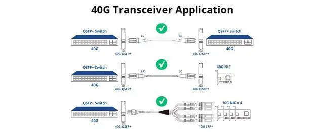 40GBASE-LR4 QSFP40G transceiver module for Single Mode Fiber, 4 CWDM lanes in 1310nm window Muxed inside module, Duplex LC connector, 10km
