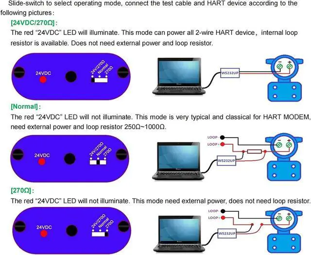 Fully HART compliant for communication with any HART instrument and error-free slave testing. DC-DC isolation power draws from USB port and needs no external power supply. Three modes: 1) 24VDC/270Omega. 2) Normal. 3) 270Omega. The mode is easily slide-switch selected so yoursquoll always have a power supply or loop resistor with you. Easy installation and use, this modem can power all 2-wire HART devices-independent of supplier. Rugged aluminium alloy case gives you industrial-grade reliability in a small package. Free HART application software for you to configure your HART device.Smart Design, smaller than a normal name card.operating system: 98/2000 / XP / 7/8/10 Brief Instruction The WS232UP USB-HART Modem provides a complete and flexible PC communication link to HART networks and power kit and loop resistor, for commissioning, servicing, calibrating, or acquiring data from any HART instrument or transmitter. The WS232UP is developed based on BELL202 modem standard, this external interface is rugged and compact and ideal choice for field service, commissioning, engineering, training, table top shows, lunch and learns and demo cases.