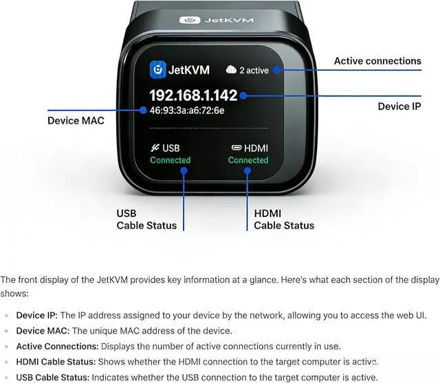 To access the JetKVM web UI, you'll need the device's IP address, which is displayed on the front screen of the JetKVM device along with the MAC address. Simply refer to this screen, note the IP address, and use it to navigate to the web UI in your browser.
