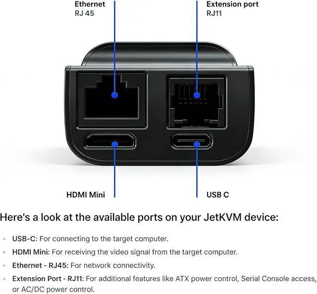 After installing the driver, JetKVM remains accessible during BIOS or UEFI boot processes. This proves extremely useful for tasks like reinstalling operating systems or mounting ISO images to install applications on the target host.Beyond standard keyboard and mouse support, JetKVM includes a virtual keyboard feature, providing basic keyboard input via the UI. This enables sending individual keystrokes to the remote computer as needed.Note: Currently, JetKVM supports only US keyboard layouts, with host key mappings defaulting to US settings.The rear of JetKVM features an RJ-12 expansion port designed for complete customization and flexibility. Whether integrating additional hardware functions or providing custom add-ons, the expansion port offers limitless possibilities for extension.