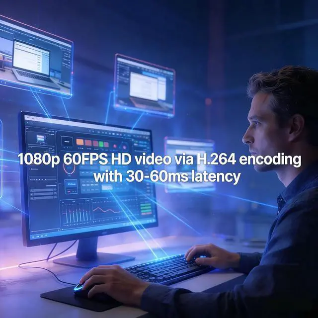 1080p@60FPS video with 30-60ms latency using H.264 encoding. Smooth mouse and keyboard interaction for responsive remote control.