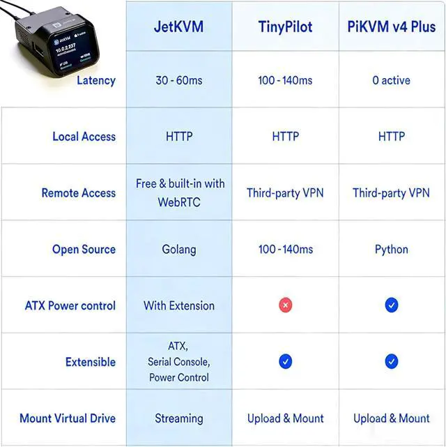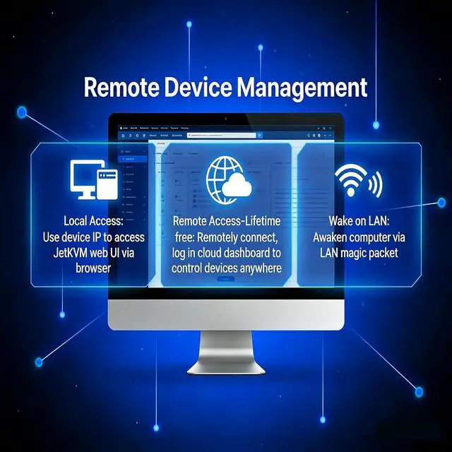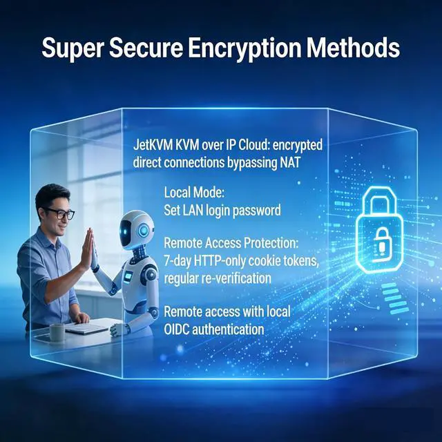 Seamless Remote Control Main features Super Secure Encryption Methods Secure Connectivity for JetKVM Three Ways of Networking Local Access Open-Source Go/React WebRTC Dashboard with Lightweight Linux System Special Features and Power Options Three Expansion Modules ATX Power Extension