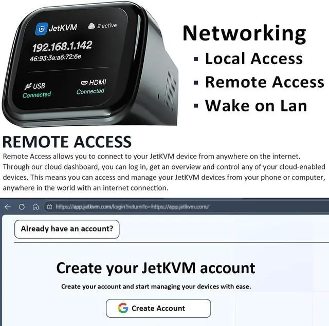 Ultra-low Latency - 1080p@60FPS video with 30-60ms latency using H.264 encoding. Smooth mouse and keyboard interaction for responsive remote control.Free & Optional Remote Access - Remote management via JetKVM Cloud using WebRTC.Open-source software - Written in Golang on Linux. Easily customizable through SSH access to the JetKVM device.