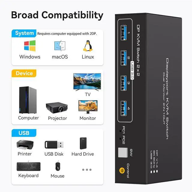 It is possible to control two computers and two monitors directly with one set of keyboard and mouse.Two monitors can support two modes:duplicate and extend.Supports resolutions up to 8K 60Hz and backward compatible.(Please note: Your computer, monitor, and the cables used must all support the corresponding resolution.)Equipped with four USB 3.0 ports, allowing you to connect scanners, hard drives, and other USB devices.Equipped with a 12V/1A power supply, ensuring stable work even when high-power devices are connected.(Please note: Connect the external power supply when using the device to ensure stable operation.)This device is compatible with computer models that have two DP ports built-in. It is suitable for monitors equipped with DP interfaces. When using macOS and Linux systems, please ensure your computer has two DP ports.It is not recommended to use additional docking stations or adapter cables. This helps avoid potential compatibility issues.