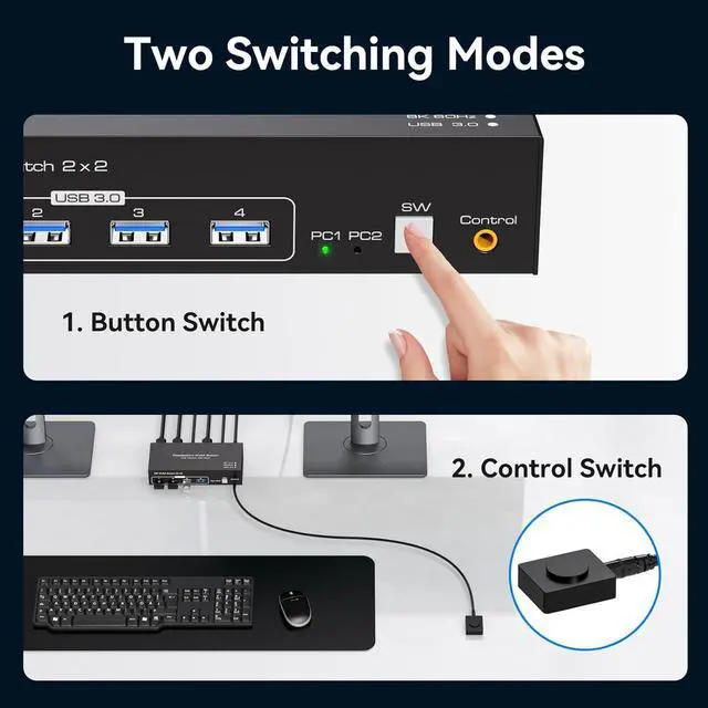 8K DP KVM Switch Easy to UseThe Displayport KVM Switches supports panel button and external wire controller switching.Using the wired extension button, you can place the KVM outside the work area, making your desktop cleaner and tidier.Or just press the panel button next to the indicator light to achieve one-click switching,Simple, quick and easy to use.NOTE: Keyboard shortcuts (hotkeys) toggles are not supported