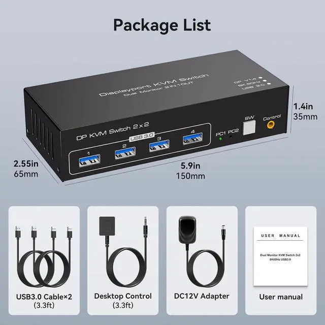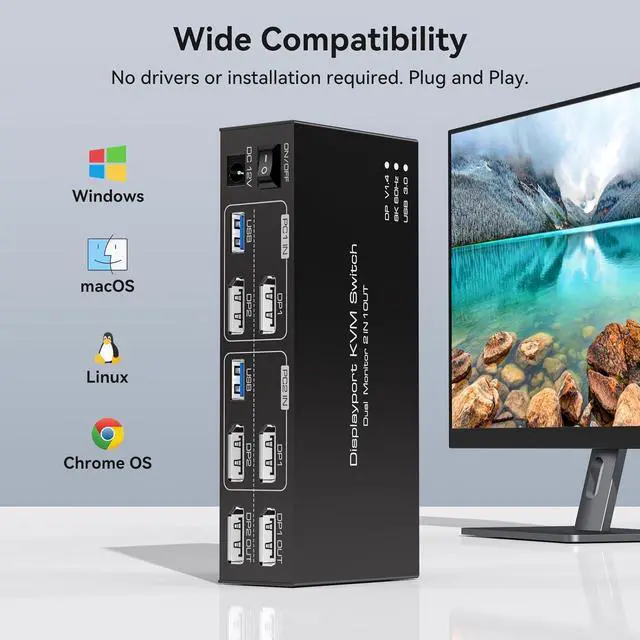 Wide Compatibility The Dual Monitor KVM Switch Display port Plug and play without any software driver, Compatible with Windows/Vista/XP and Mac OS, Linux and Unix.The DP KVM switch supports multiple input devices such as PC, laptop, Apple TV, PS3/PS4, Xbox, and is widely used in offices, multimedia teaching, conference rooms, etc.NOTE:Please use a 12V DC power supply to power it during use