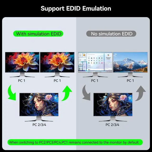 Yeswhen the monitors are switched between 4 computers, the original window position will not be changed, while other KVM require the user to rearrange the window order.