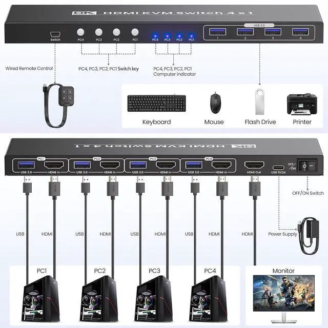USB 3.0 Ultra HD 8K 4 Port HDMI KVM Switch - Effortlessly Manage Multiple Devices with a Single Monitor and 1 set of Keyboard Mouse HDMI KVM Switch 1 Monitor 4 Computers for Maximum Flexibility Fast and Reliable Data Transfer with USB 3.0 Effortless Switching: Two Simple Ways Connection Diagram