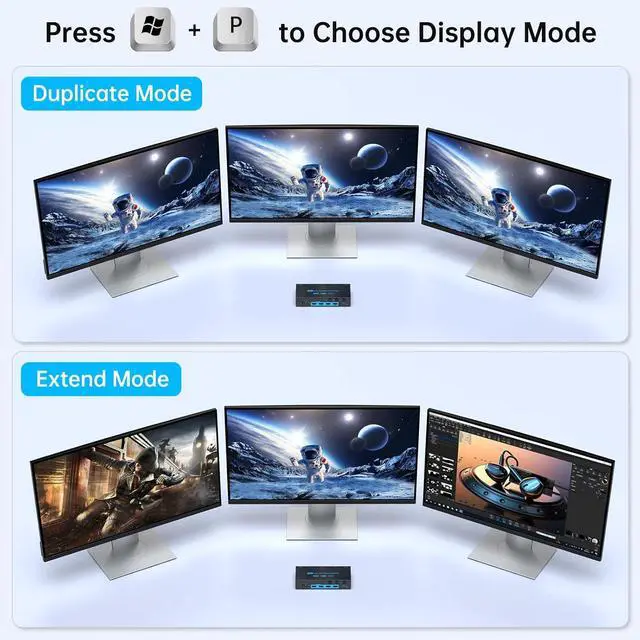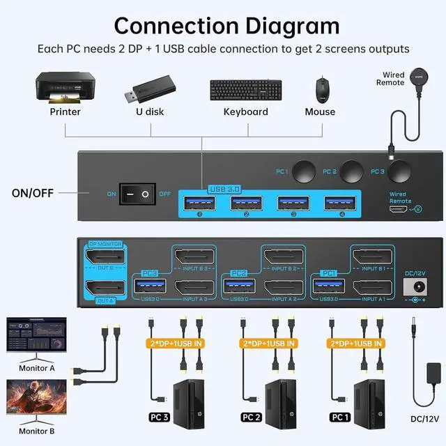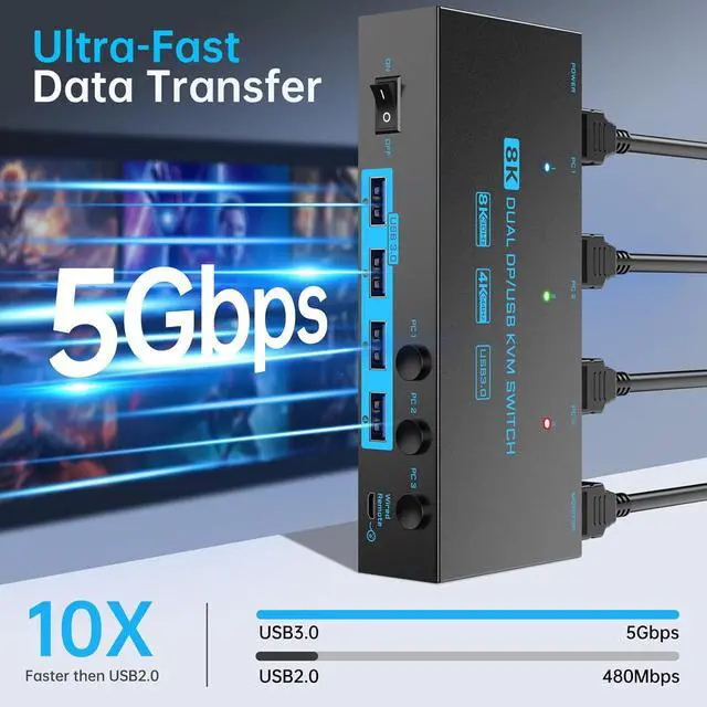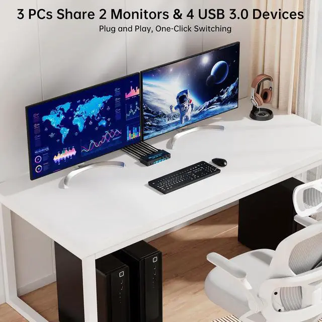 1Ultra 8K Visual Effect25Gbps Data Transfer3Easy to Switch1Wide Compatibility2Mirror & Extend Display 2 Monitors 3 Computers Dual Displayport 1.4 KVM Switch Plug and Play, Easy to Install Create A Tidy and Efficient Workspace with 3 PCs Dual Monitor KVM Switch