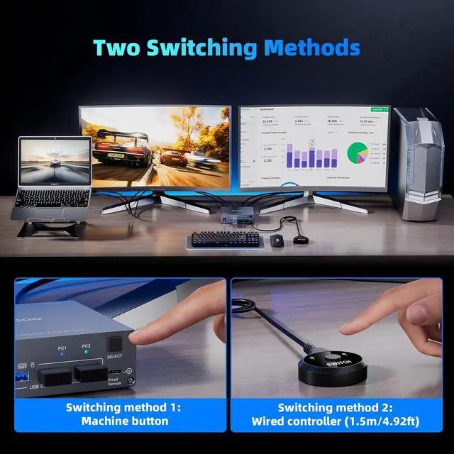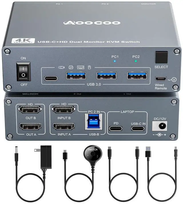 USB C Dual Monitor KVMThe docking station KVM switch connects 1 laptop+1 desktop and 2 monitors with 1x USB-C (MST)+dual HDMI inputs and 2x HDMI outputs. Seamlessly switch between your work desk and personal laptop to boost your productivity with this USB-C HDMI KVM switch.