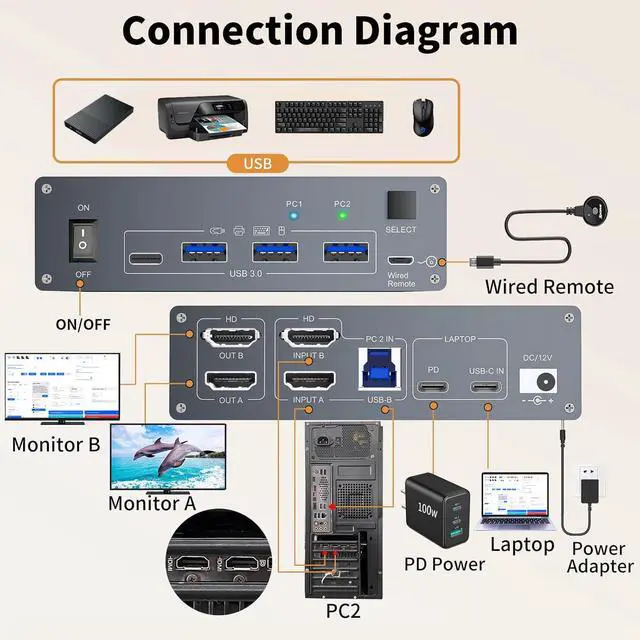 1Multiple Display Modes2HDMI USB C KVM3Two Switching Methods4Widely Compatible5Packing List Dual Monitor KVM for Laptop and Desktop kvm Charging for Laptop Connection diagram Supports 4K@60Hz USB 3.0 -A and USB C KVM Switch