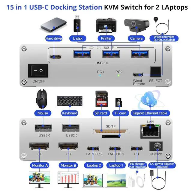 KVM Switch USB C Dock Designed for Two Laptops with 2 USB C ports, 2 HDMI output 4K@60Hz, 4 USB3.0 + 2 USB2.0 ports, 1 Gigabit Ethernet port, 1 SD and 1 TF card slot, PD 40W for each laptop, DC12V power supply