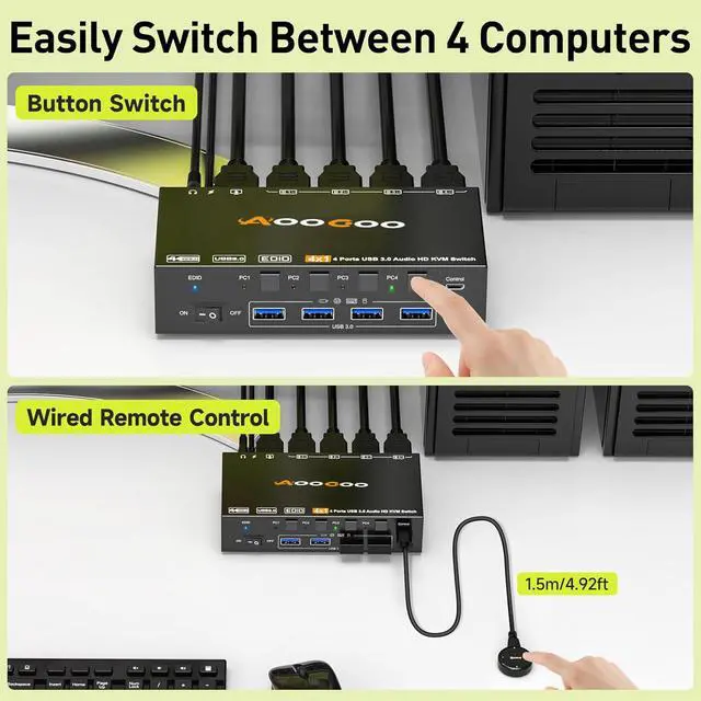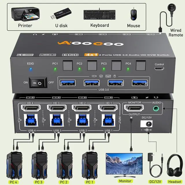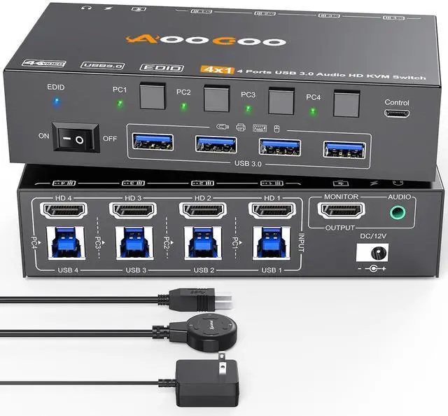 4 PC 1 Monitor HDMI KVM Switch hdmi kvm switch KVM Switch with EDID 8K@60Hz HDMI KVM Switch 4 PC share 1 Monitor and 4 USB3.0 Devices Two switching methods More details Power switch DC12V Power 4 USB3.0 Support Audio More Recommendations and Options